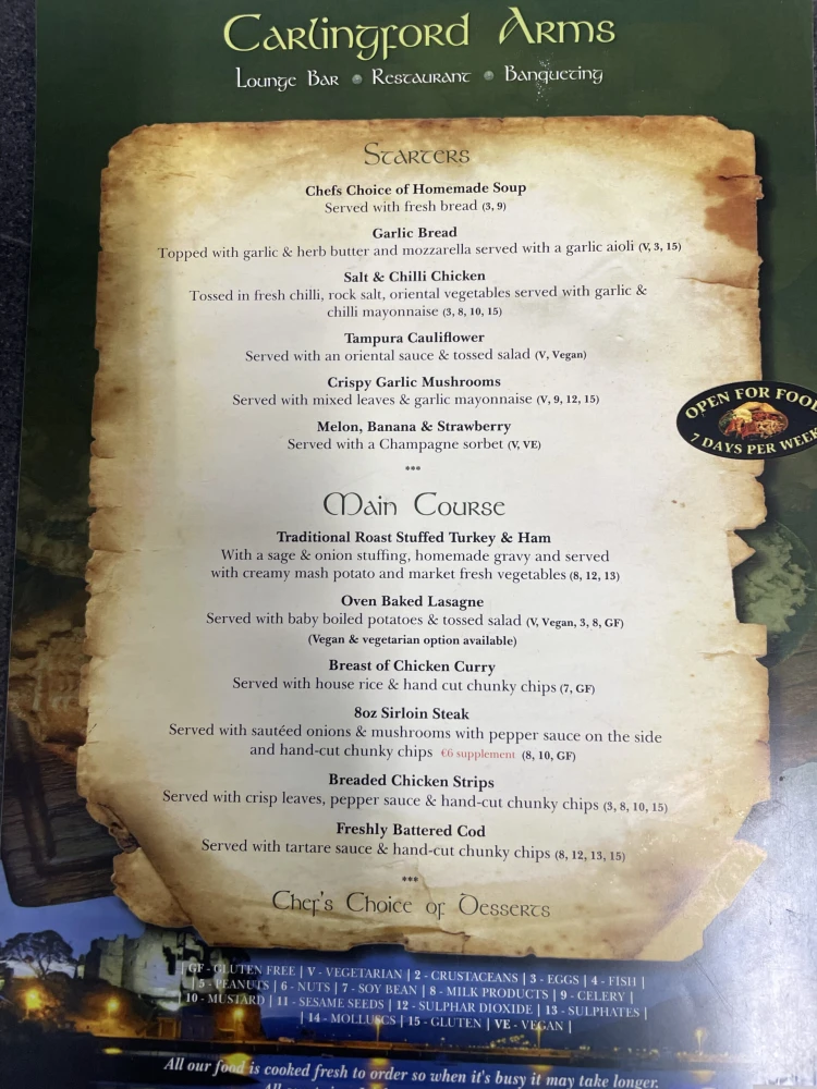 Here's what you can expect during your dining experience at the Carlingford Arms: